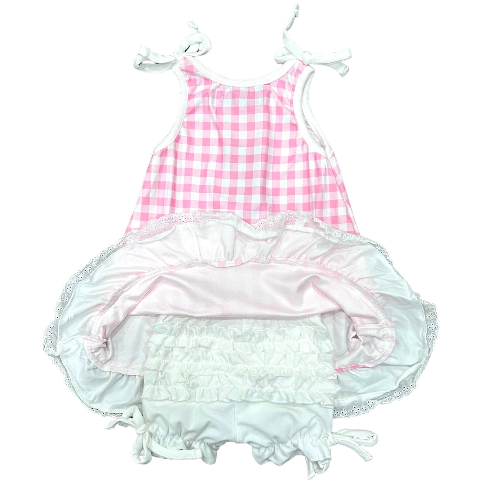 A summer gown for girls in her favorite color. Our Pink Gingham nightgown with white eyelet trim and bows at the shoulders comes with a pair of ruffled bloomers for a little extra modesty when she needs it. There ’ s even a matching gown for her doll. Let the bedtime fun commence.