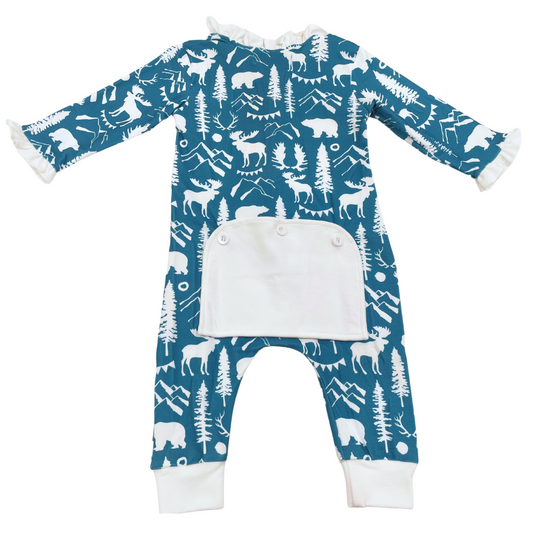 One-Piece Ruffle Buttflap Pajams - Blue Mountain Animals