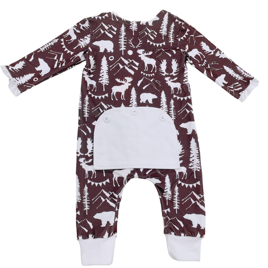 One-Piece Ruffle Buttflap Pajamas- Espresso Mountain Animals