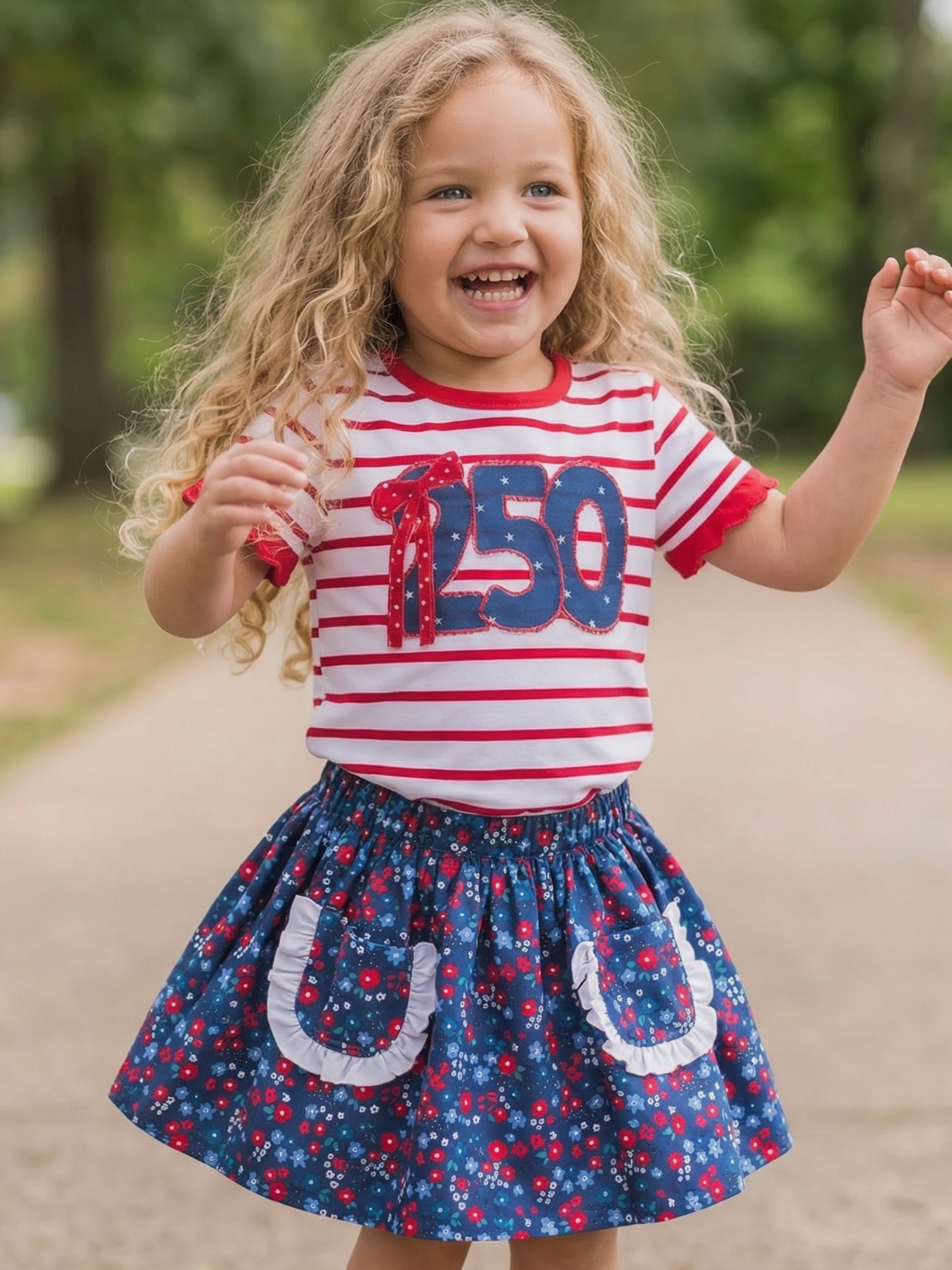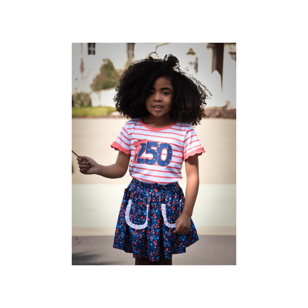 Celebrate America's milestone in style with Mae's patriotic red striped tee, featuring delicate scalloped sleeves and a bold 250 applique. Perfect for backyard barbecues, family gatherings, and outdoor festivities, this spirited design brings festive energy to every summer moment. Comfortable and proudly patriotic, it's your go-to pick for making memories with loved ones under the sun.
