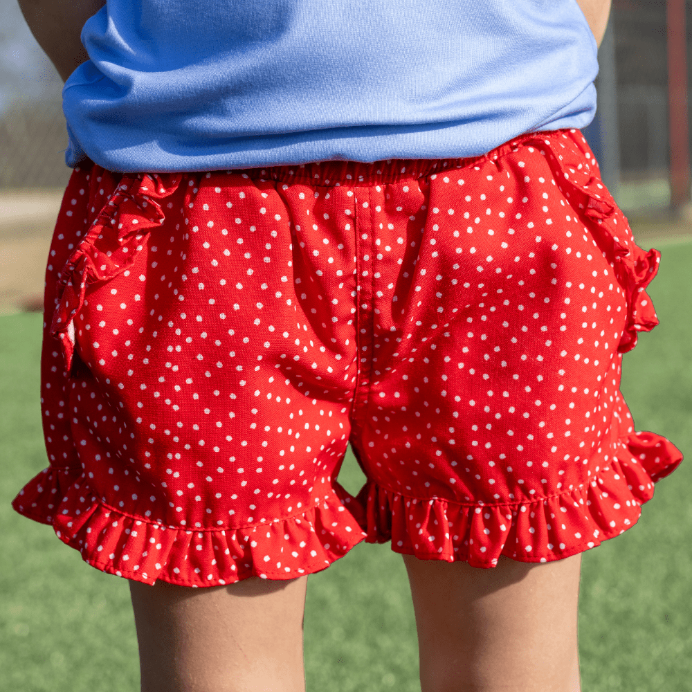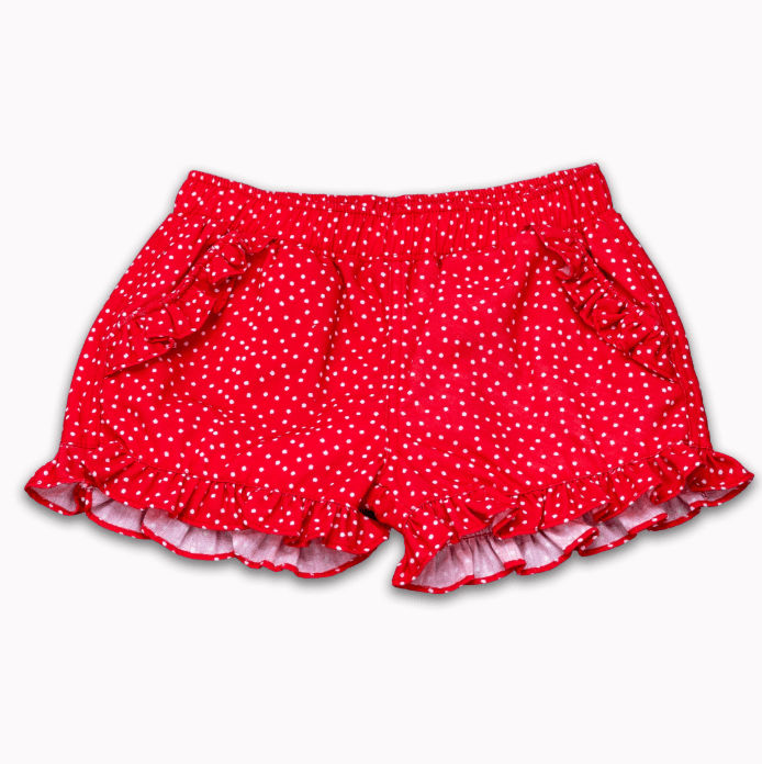 Rose Ruffle Shorts - Liberty Dot Twirl-worthy shorts with playful ruffles and a charming liberty dot print! Perfect for girls who love a little extra flair, these shorts combine comfort with personality. The soft fabric moves with every adventure, while the ruffled edges add that special something that makes getting dressed fun. Whether she's playing in the backyard or heading out for the day, these shorts bring joy to her wardrobe.