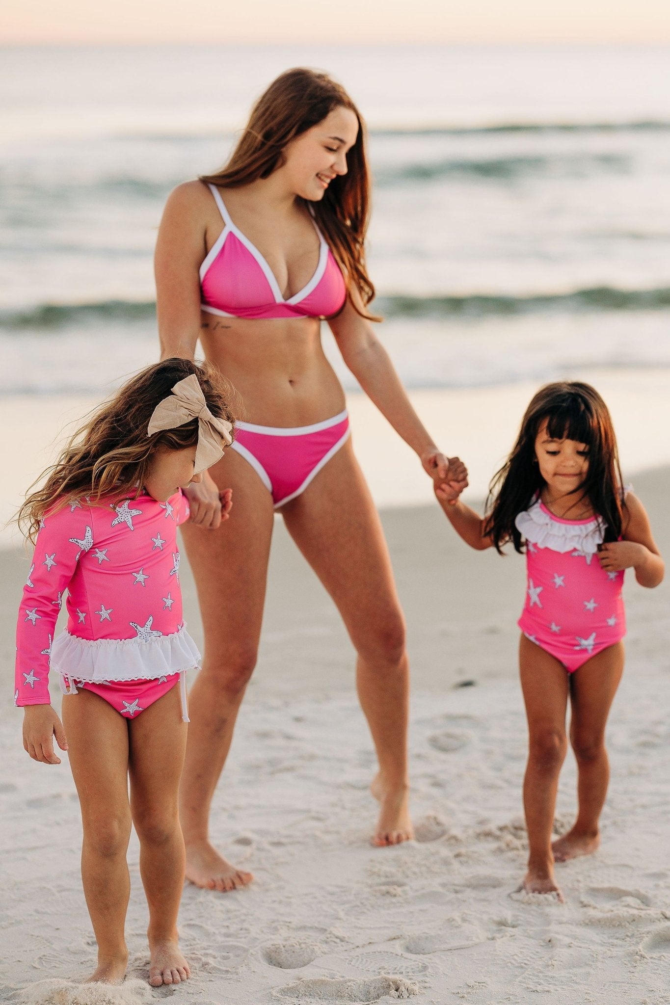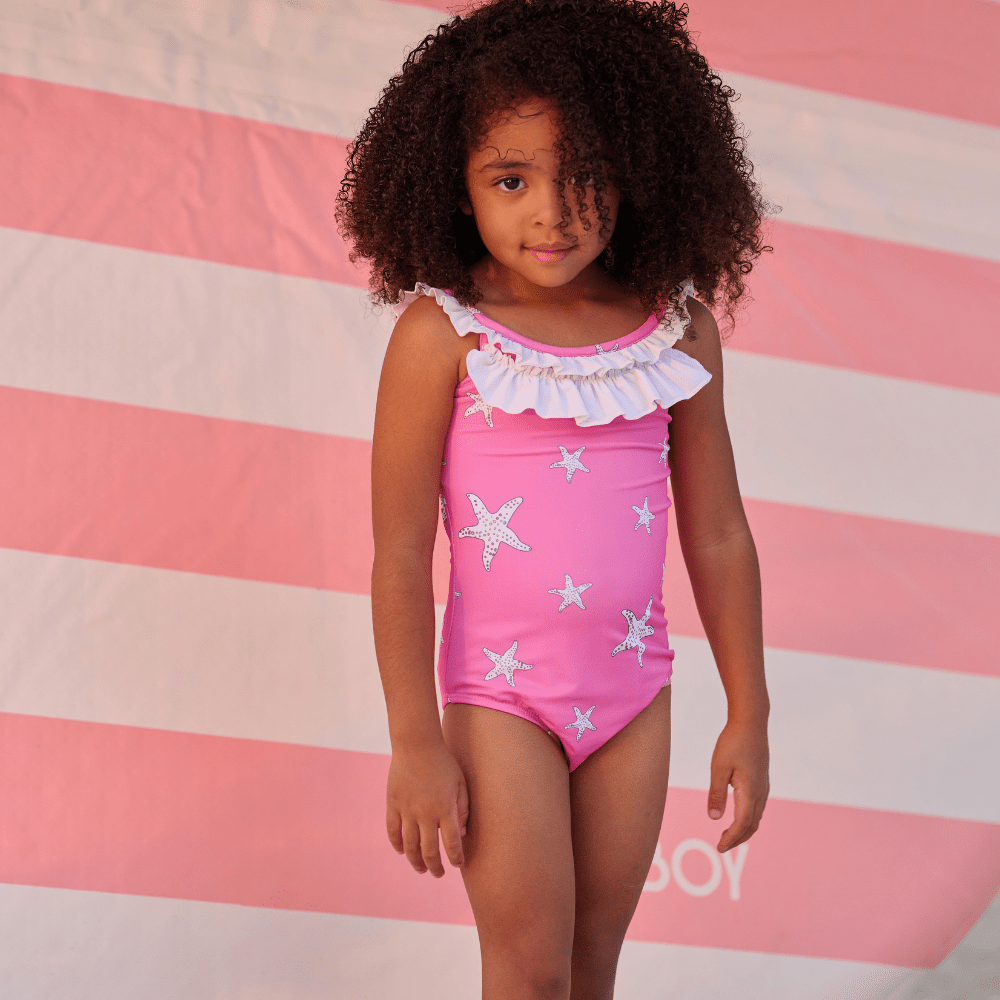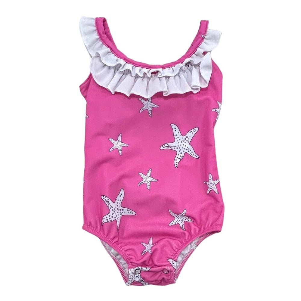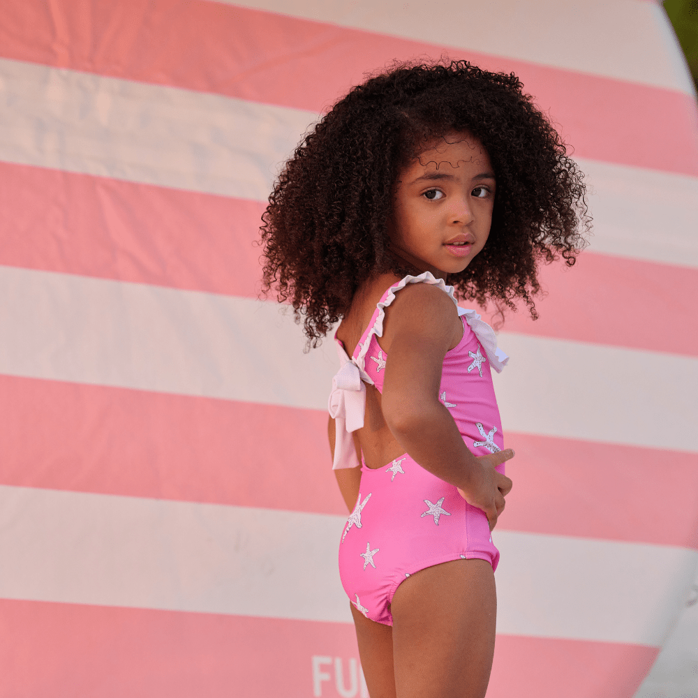 Dive into the waves with our playful pink starfish bow back swimsuit for girls! This swimsuit features a cute bow back design and is adorned with pink starfish, making it perfect for a day at the beach. Say "sea you later" to boring swimsuits and make a splash with this fun and trendy swimsuit!