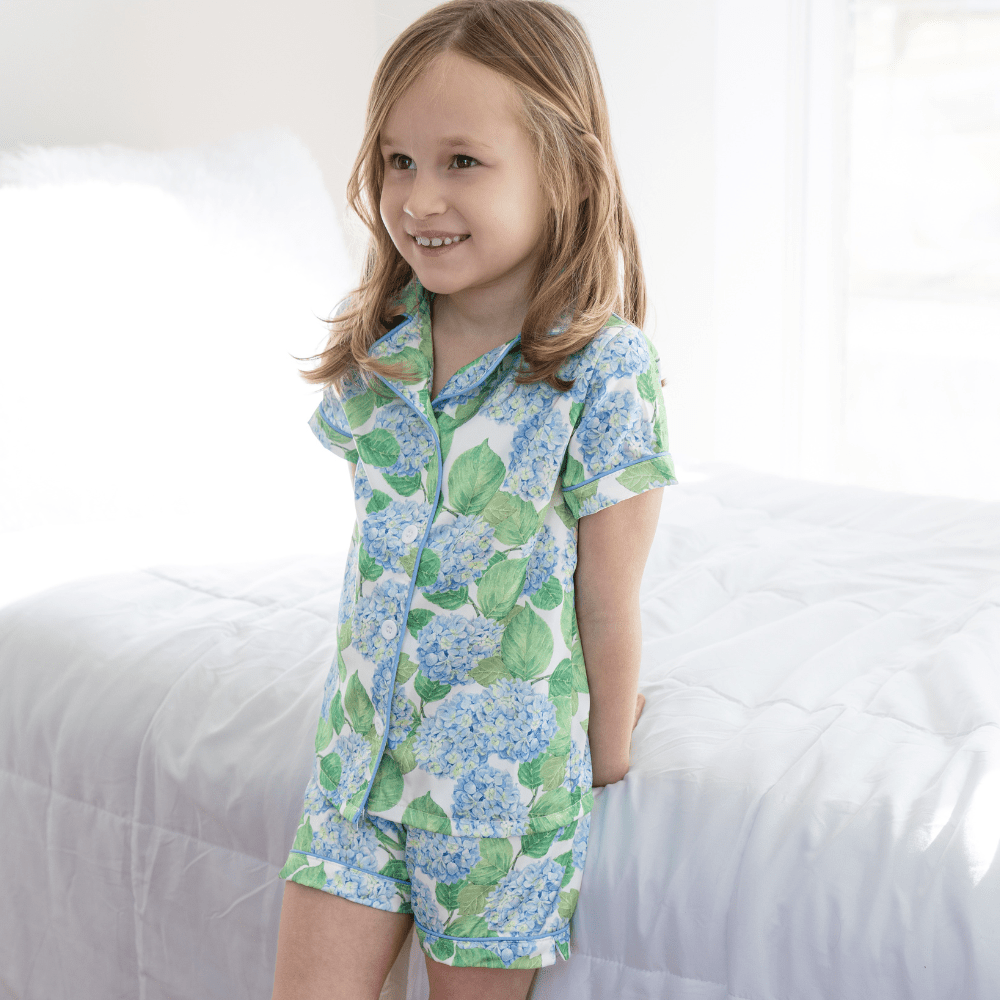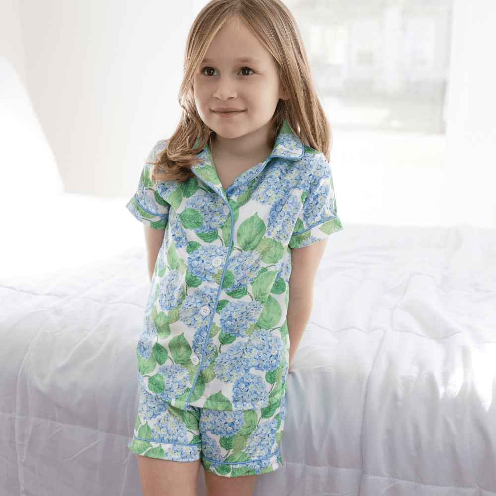 Get ready to lounge in style with our Charlie Satin Short Set in Blue Hydrangeas. This sweet and soft set is perfect for snuggling up with Mom. You won't be able to resist its beauty and comfort!