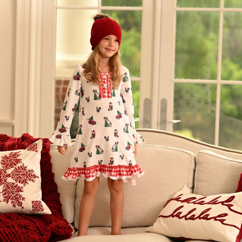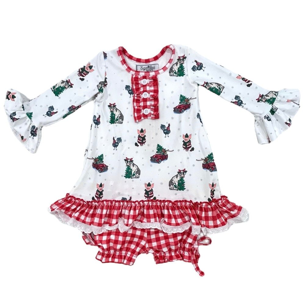 Celebrate Christmas on the farm with our festive ruffle gown and bloomers set. Perfect for lounging during the holidays. (Giddy up!)