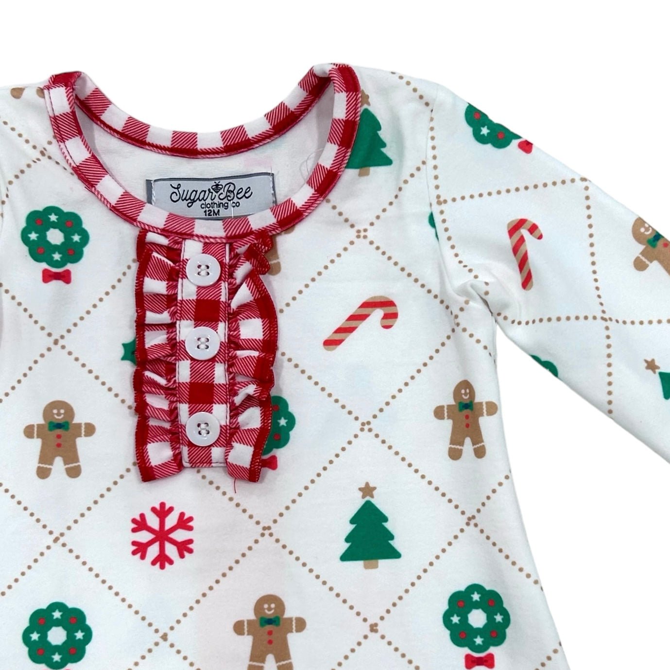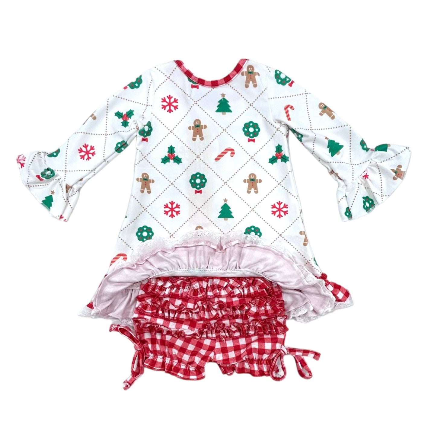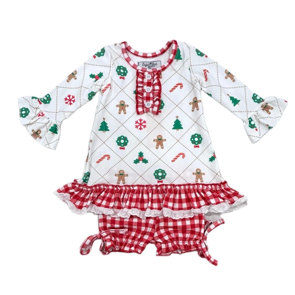 Make your little girl's holiday extra sweet with our Quilted Gingerbread Holiday Lounge set! This adorable gown and bloomers combo features a gingerbread print, perfect for spreading Christmas cheer. Get ready for a holiday full of cuteness and comfort.