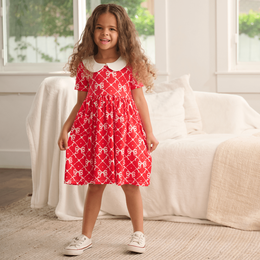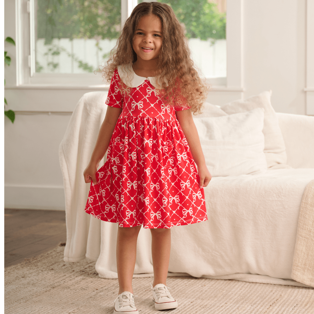 Get ready to twirl in this adorable Claire dress - perfect for Valentine's Day! With playful colors and a fun design, you'll have a sweet and stylish look that's perfect for any occasion. Show your love with this charming dress!