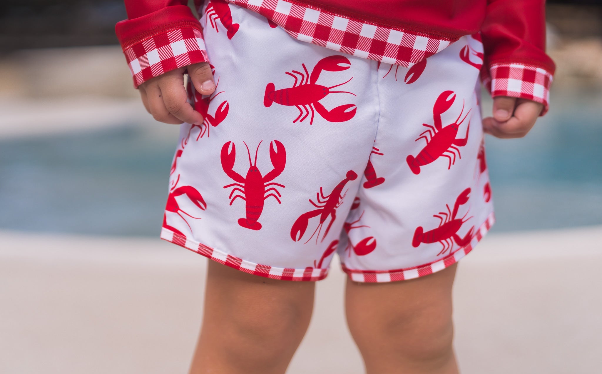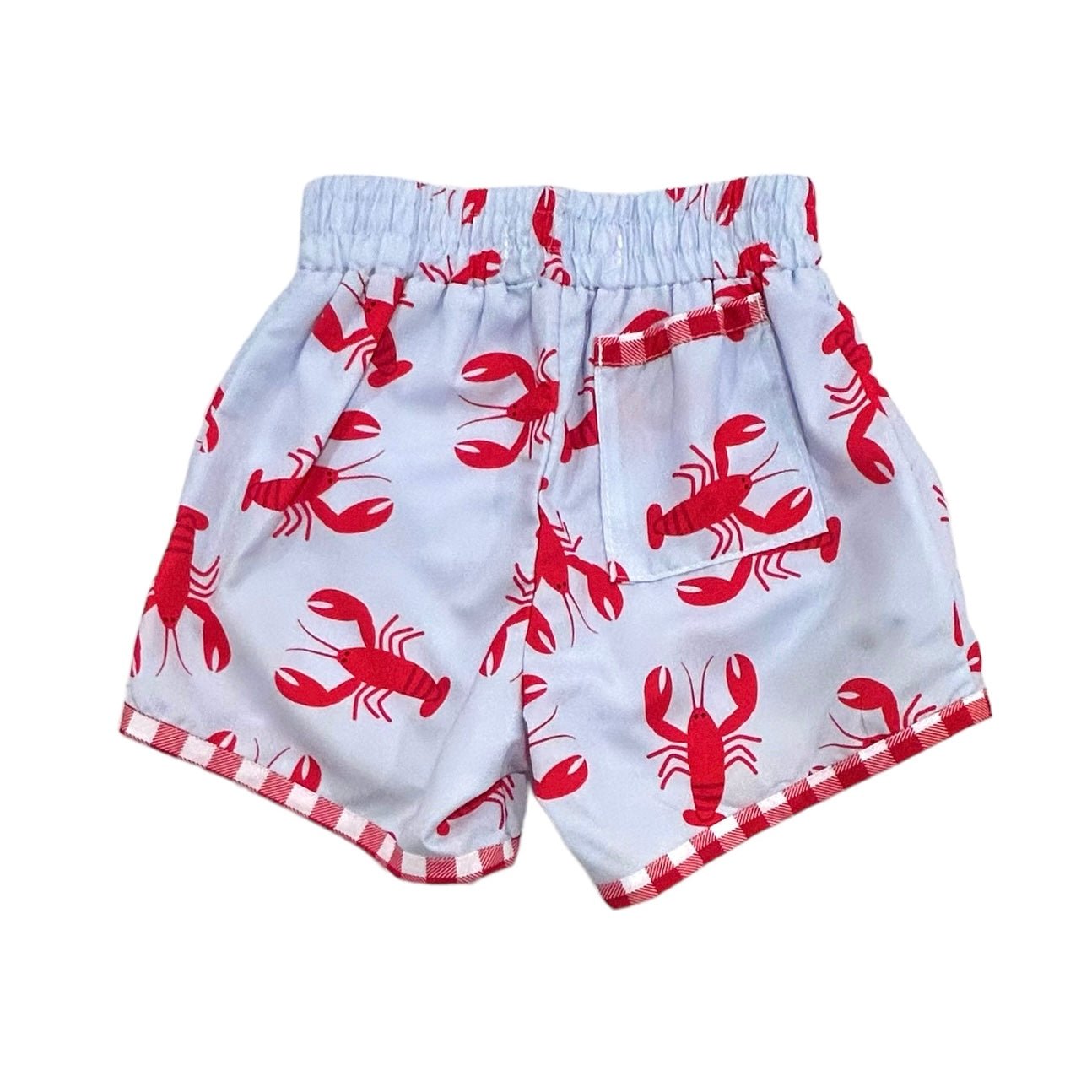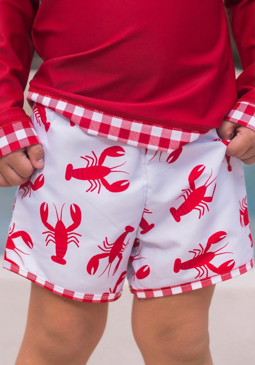 Elastic waist, unisex, swim shorts in our exclusive Crawfish print with red gingham trim. Match up with our girl’s Crawfish Swim pieces, Floatie Cover and matching Swim Towel. Add our Red Gingham Rashguard for long sleeve coverage in the sun.