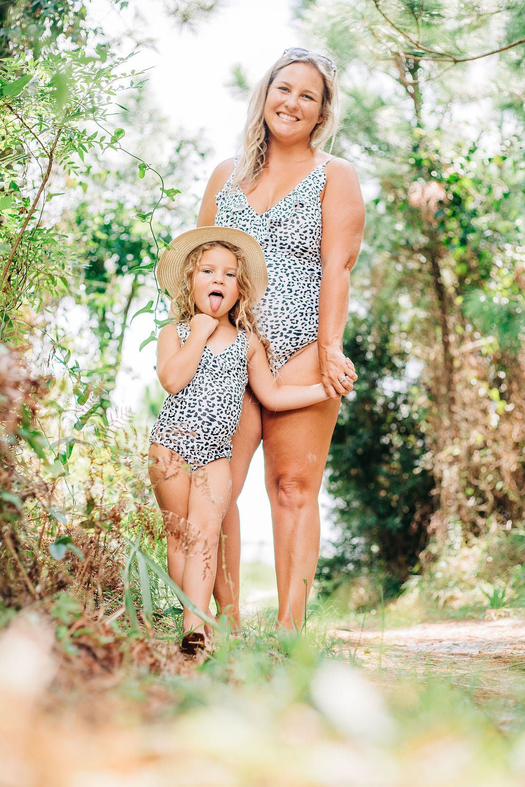 Get ready for some wild fun in the pool with this matching mommy-and-me swimsuit featuring leopard patterns.