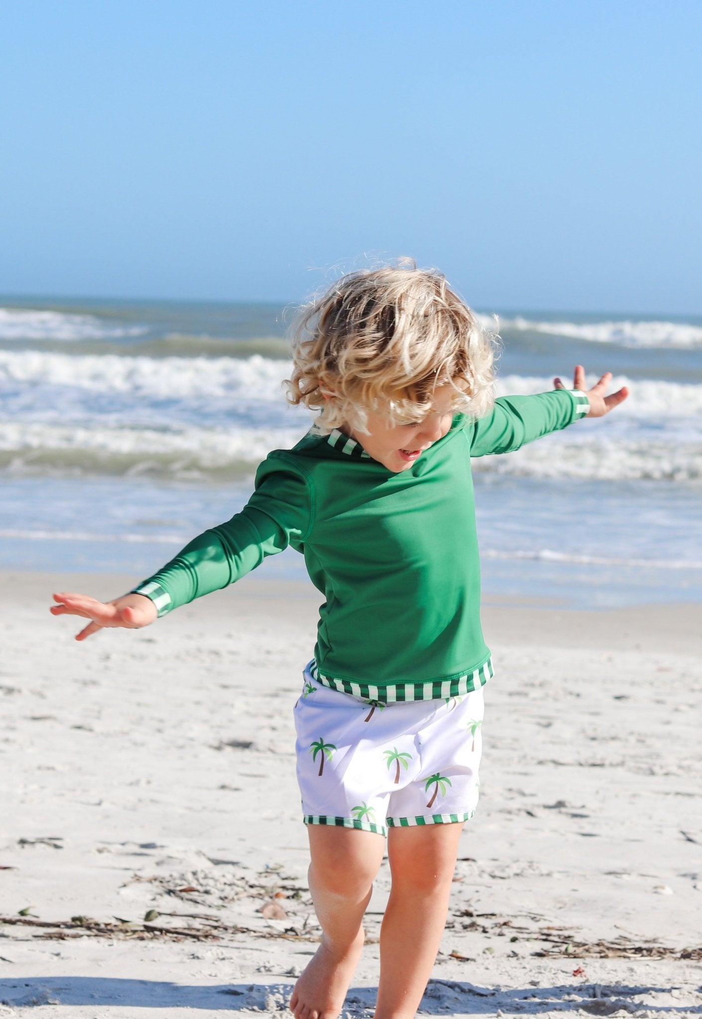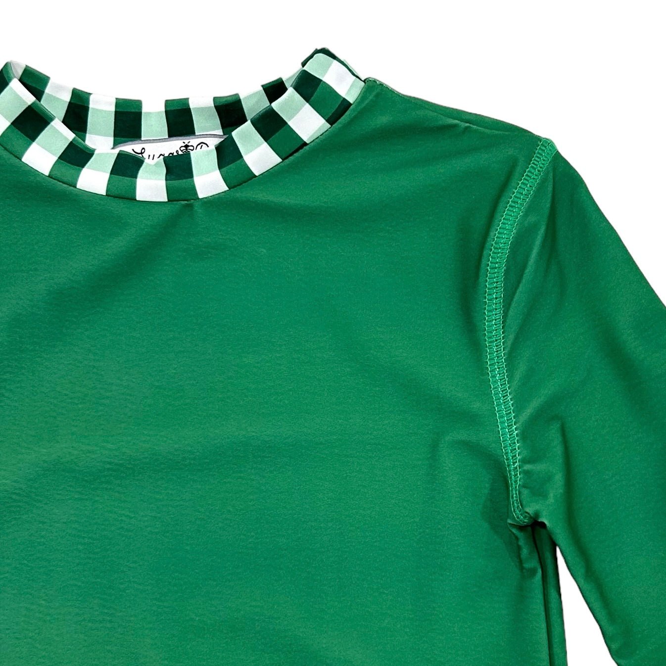 Our rashguards are unisex and incredibly versatile for outdoor play. They keep the sun away from tender arms and backs while being stylish and unique at the same time. This one is solid green with gingham trim. Pair over any sleeveless swimsuit or with our matching swim shorts.