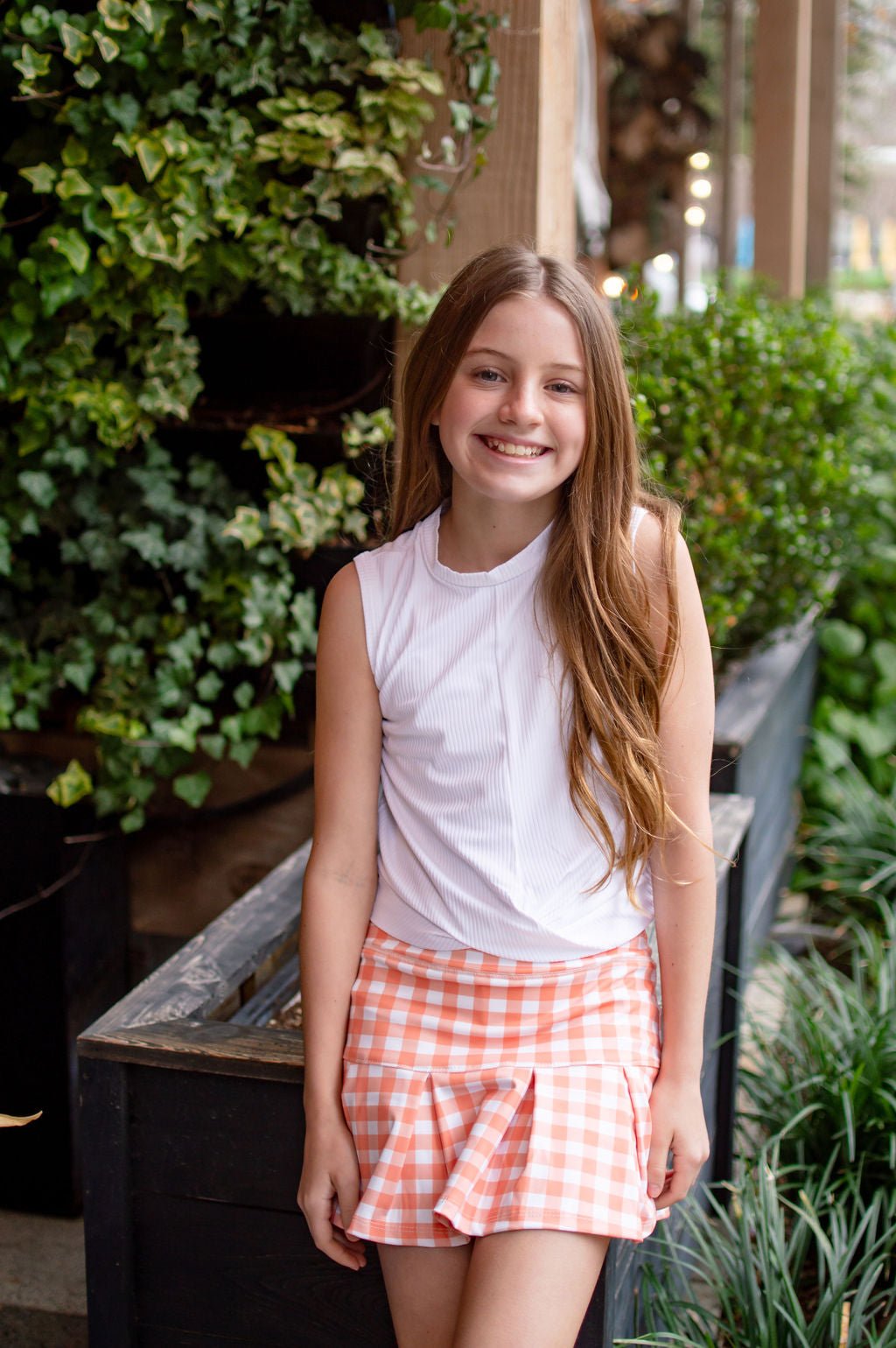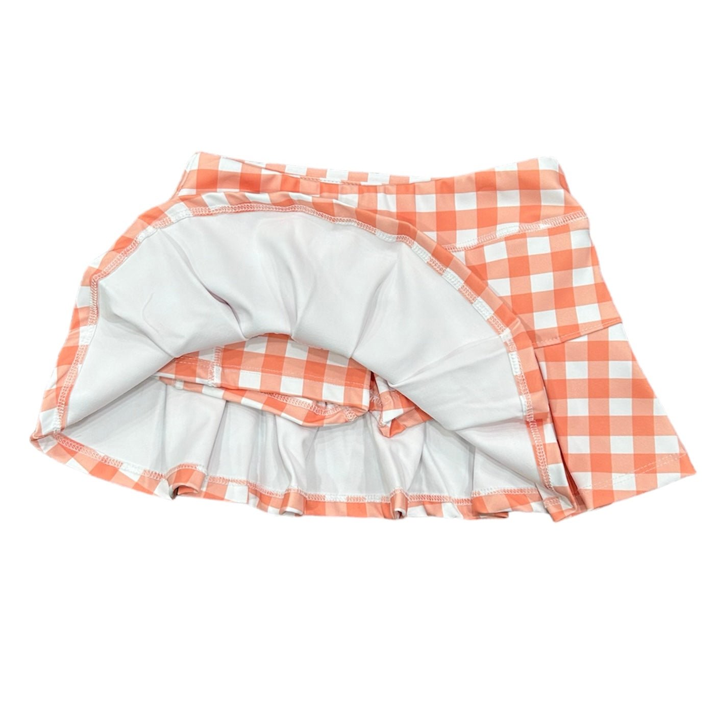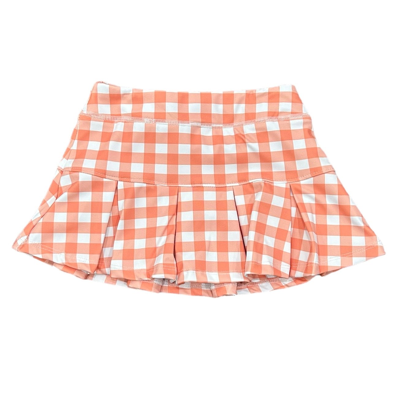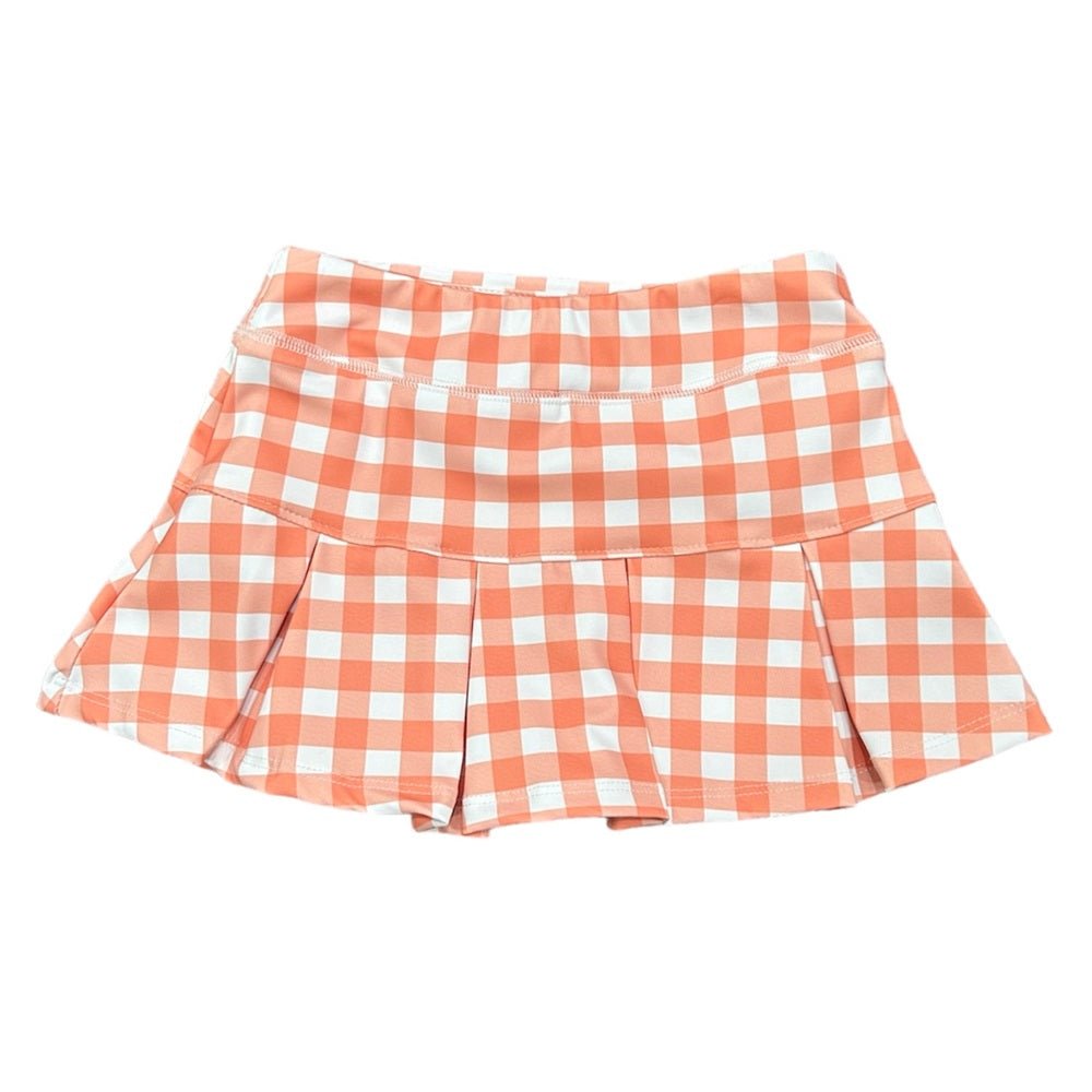 "Score a fashion love match with this mommy and me orange gingham pleated tennis skirt. Perfect for twinning on the court or off, its playful pleats and lively orangeade hue will have you serving up style with a wink and a smile. Advantage: you!"