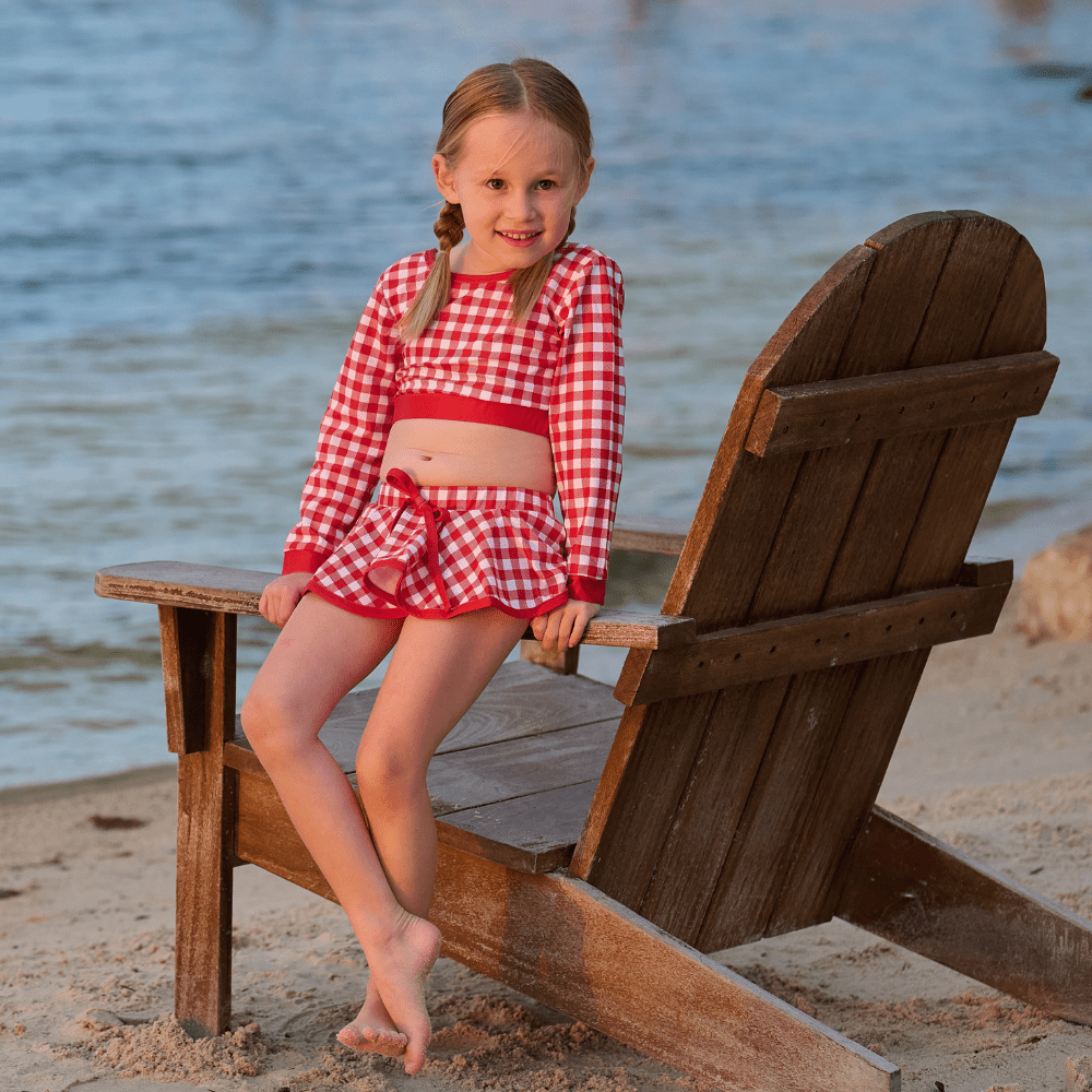 This two-piece suit in cheery, cherry Red Gingham starts with a trendy crop top with long sleeves to keep the sun off her arms for days at the lake or by the pool, and a swingy, skirted bottom she ’ ll love wearing.