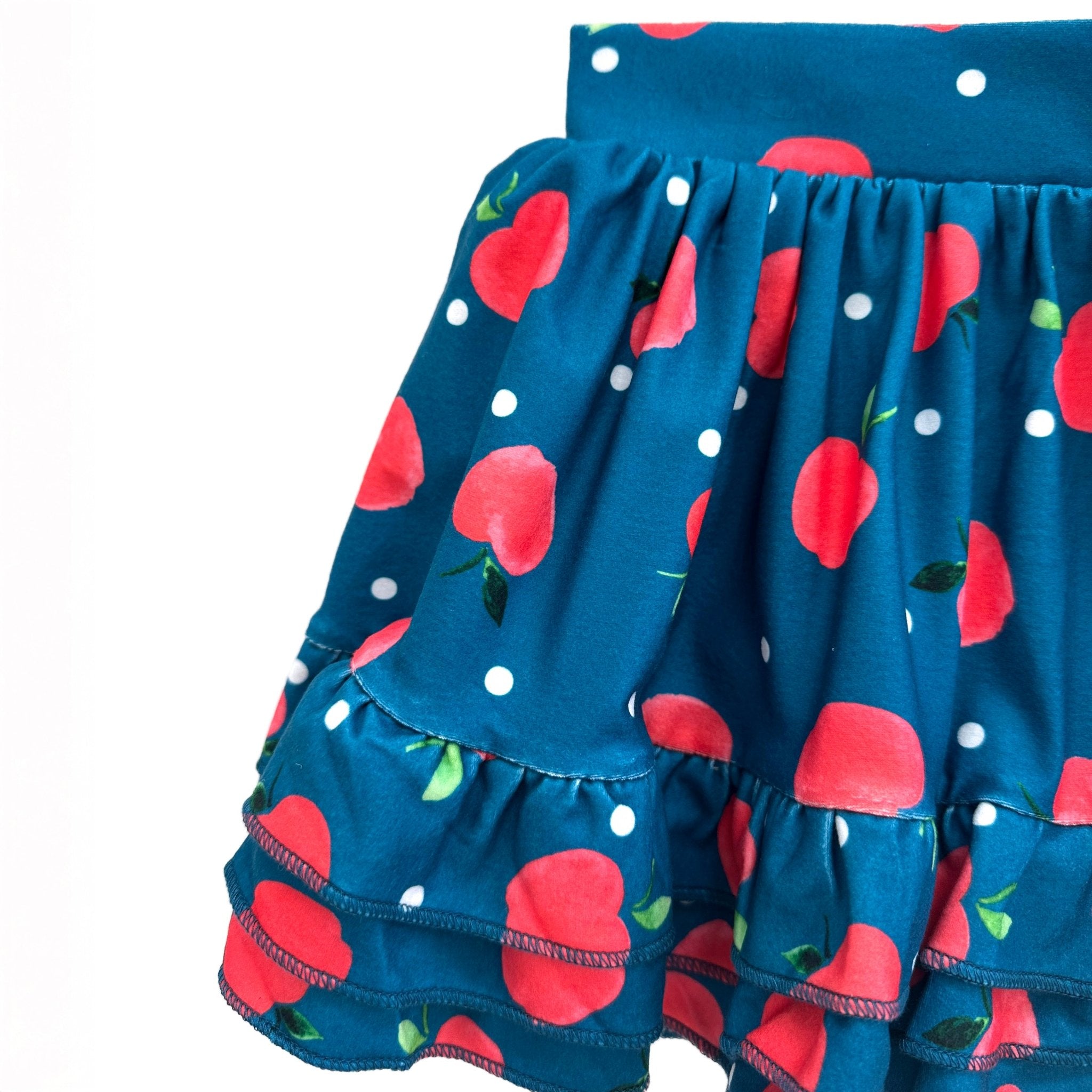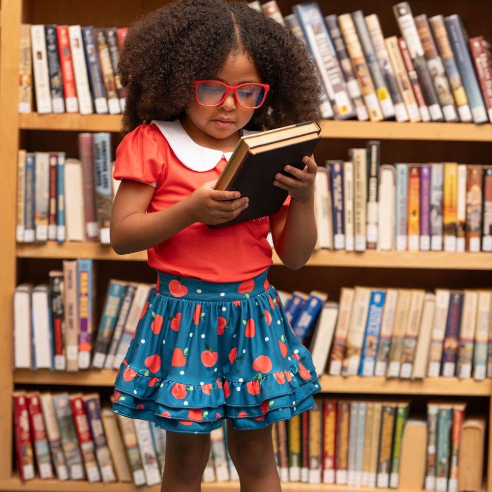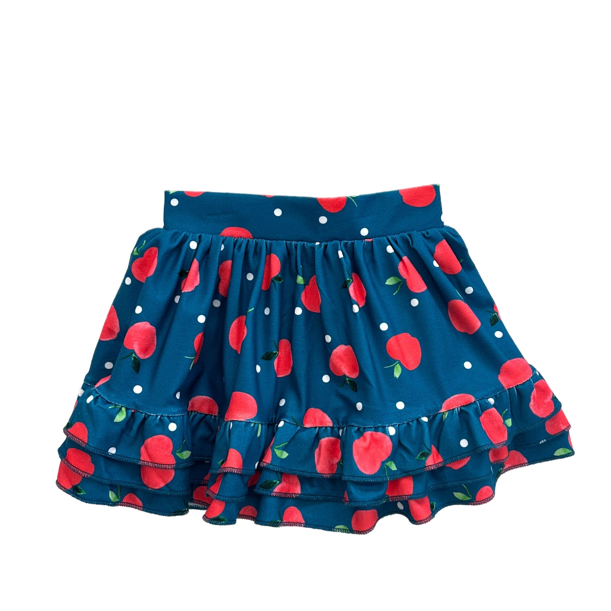 This adorable Ruffle Skort features a charming apple pattern on navy blue fabric - perfect for school days, playground adventures, and apple-picking season! The playful ruffles add a touch of fun while the skort design combines the look of a skirt with the practicality of shorts for carefree recess play.