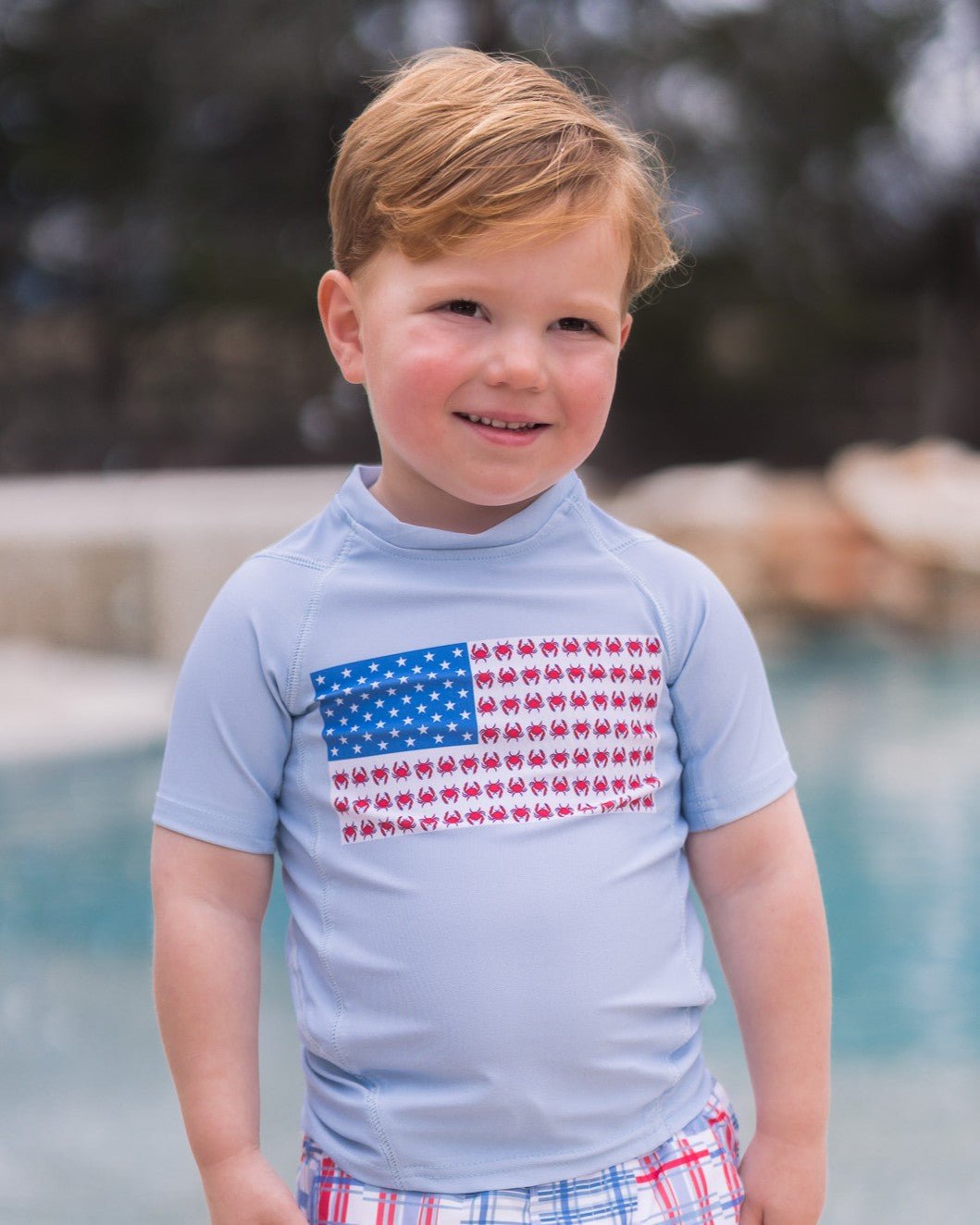 Get your little guy ready for some fun in the sun with our Short Sleeve Rashguard featuring a playful red, white, and blue crab flag. Perfect for the beach or pool, this top will keep him protected from the sun while he swims and plays. A must-have for any beach day!
